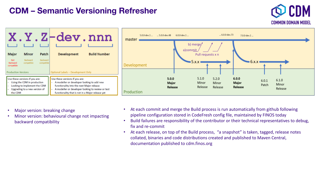 - The latest development version (i.e. with a pre-release tag) fosters continued, rapid change development and involves model contributions made by the industry community. Changes that break backward compatibility are allowed. This development version is available in read-only and read-write access on the CDM's modelling-platforms.