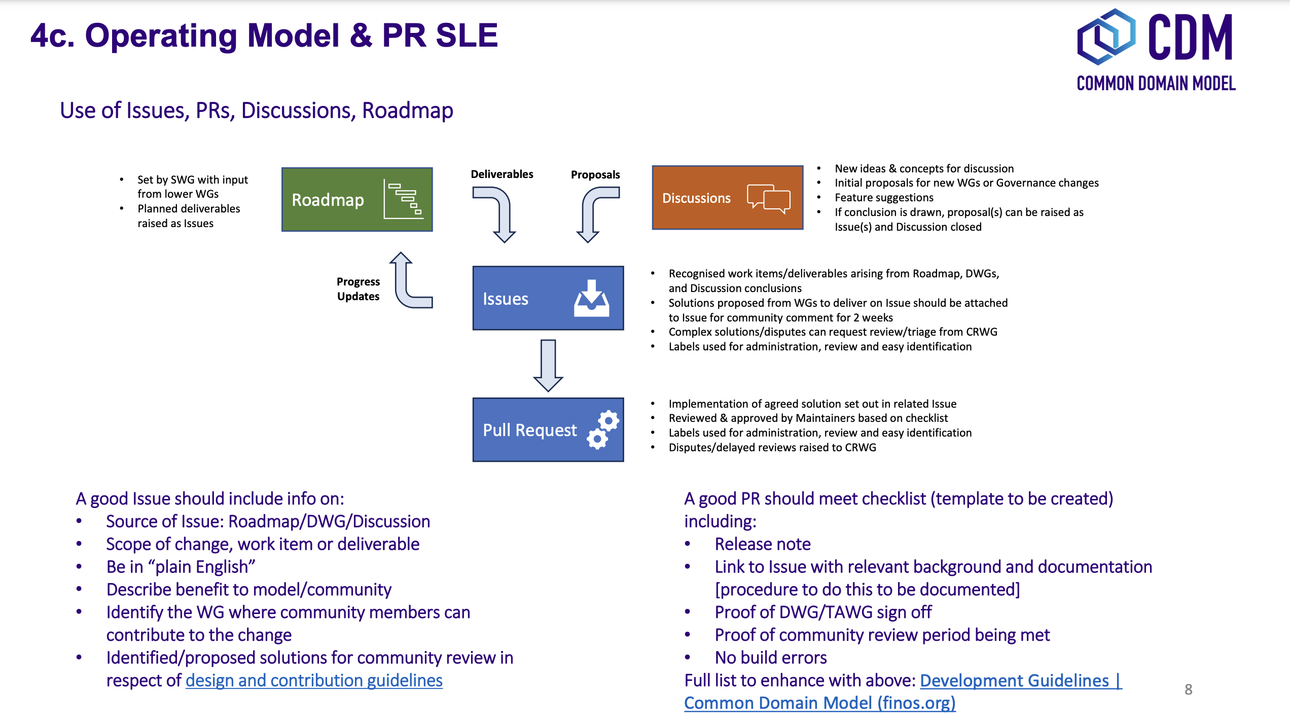 - Maintainers of the CDM Steering Working Group will approve merging of the proposed “Pre-Draft” changes (coming from other Working Groups or otherwise from community) into the repo.